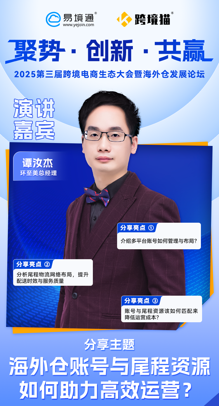 在備受期待的嘉賓陣容中,環(huán)至美總經(jīng)理譚汝杰的演講是焦點之一。作為深耕跨境物流領域十余年的資深專家,他將以《海外倉賬號與尾程資源如何助力高效運營?》為主題,直擊行業(yè)痛點,分享三大核心干貨: