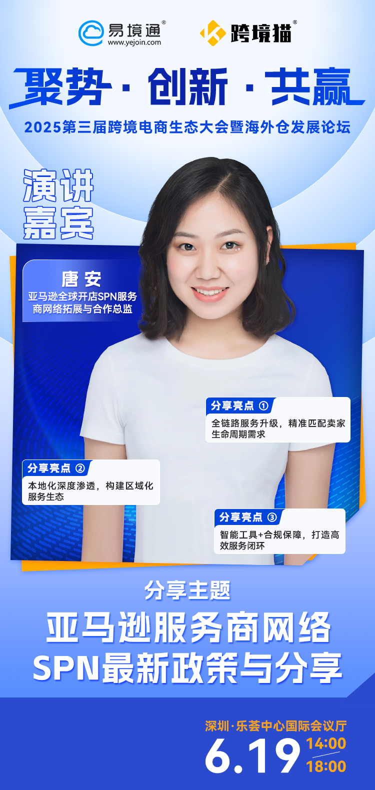 作為全球跨境電商領(lǐng)域的領(lǐng)軍平臺(tái),亞馬遜全球開店將深度參與本屆大會(huì)。其SPN服務(wù)商網(wǎng)絡(luò)拓展與合作總監(jiān)唐安將重磅登場(chǎng),帶來主題演講《亞馬遜服務(wù)商網(wǎng)絡(luò)SPN最新政策與分享》,主要圍繞以下三大核心內(nèi)容: