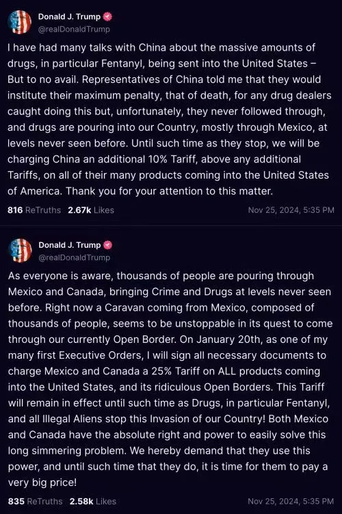盡管在過(guò)去的競(jìng)選過(guò)程中,特朗普已多次強(qiáng)調(diào)“關(guān)稅”這一競(jìng)選綱領(lǐng)支柱,甚至放狠話稱:“要讓那些不再使用美元的國(guó)家付出高昂代價(jià),對(duì)其征收100%的關(guān)稅?!?/span>但這是其當(dāng)選候任總統(tǒng)后,首次明確釋放此類信號(hào)。