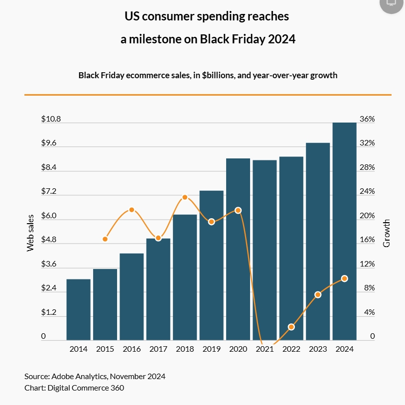 根據(jù)Adobe Analytics的數(shù)據(jù),今年的黑色星期五,美國(guó)電商銷售額創(chuàng)下新高,達(dá)到108億美元,同比增長(zhǎng)10.2%。這是2017年在線消費(fèi)者網(wǎng)購(gòu)支出的兩倍多,當(dāng)時(shí)的銷售額剛剛超過(guò)50億美元。