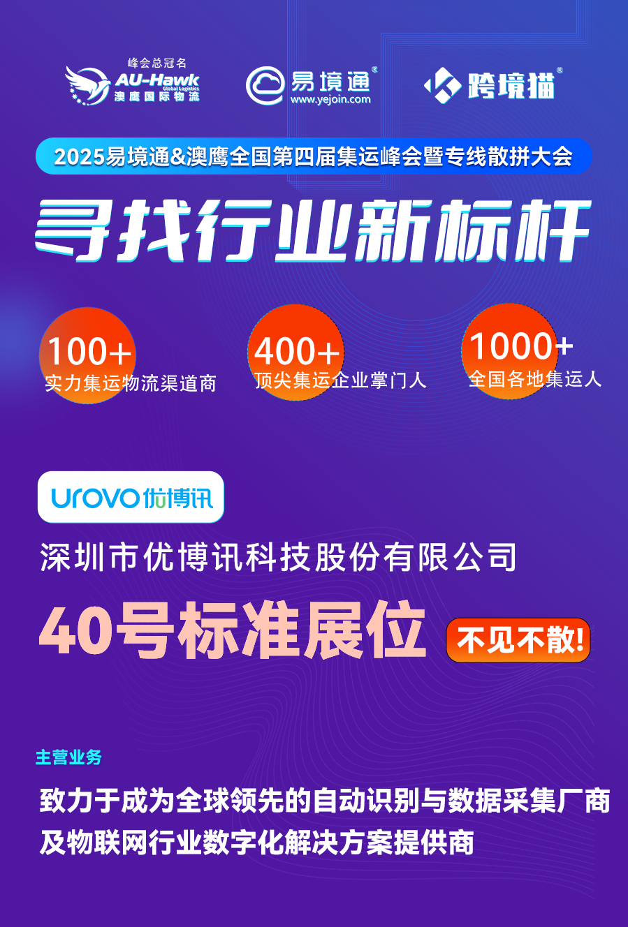 在即將舉行的易境通&澳鷹全國(guó)第四屆集運(yùn)峰會(huì)上,深圳市優(yōu)博訊科技股份有限公司將在展會(huì)現(xiàn)場(chǎng)亮相,展示其創(chuàng)新的AIDC(自動(dòng)識(shí)別與數(shù)據(jù)采集)技術(shù)和物聯(lián)網(wǎng)(IoT)解決方案,攜手各方伙伴共探集運(yùn)行業(yè)的未來(lái)機(jī)遇!