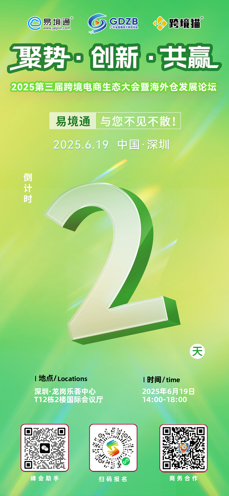 易境通2025第三屆跨境電商生態(tài)大會暨海外倉發(fā)展論壇,還剩最后兩天!6月19日,來深圳樂薈中心,眾多行業(yè)大咖共聚一堂,探討破局之道,共贏跨境電商新未來!
