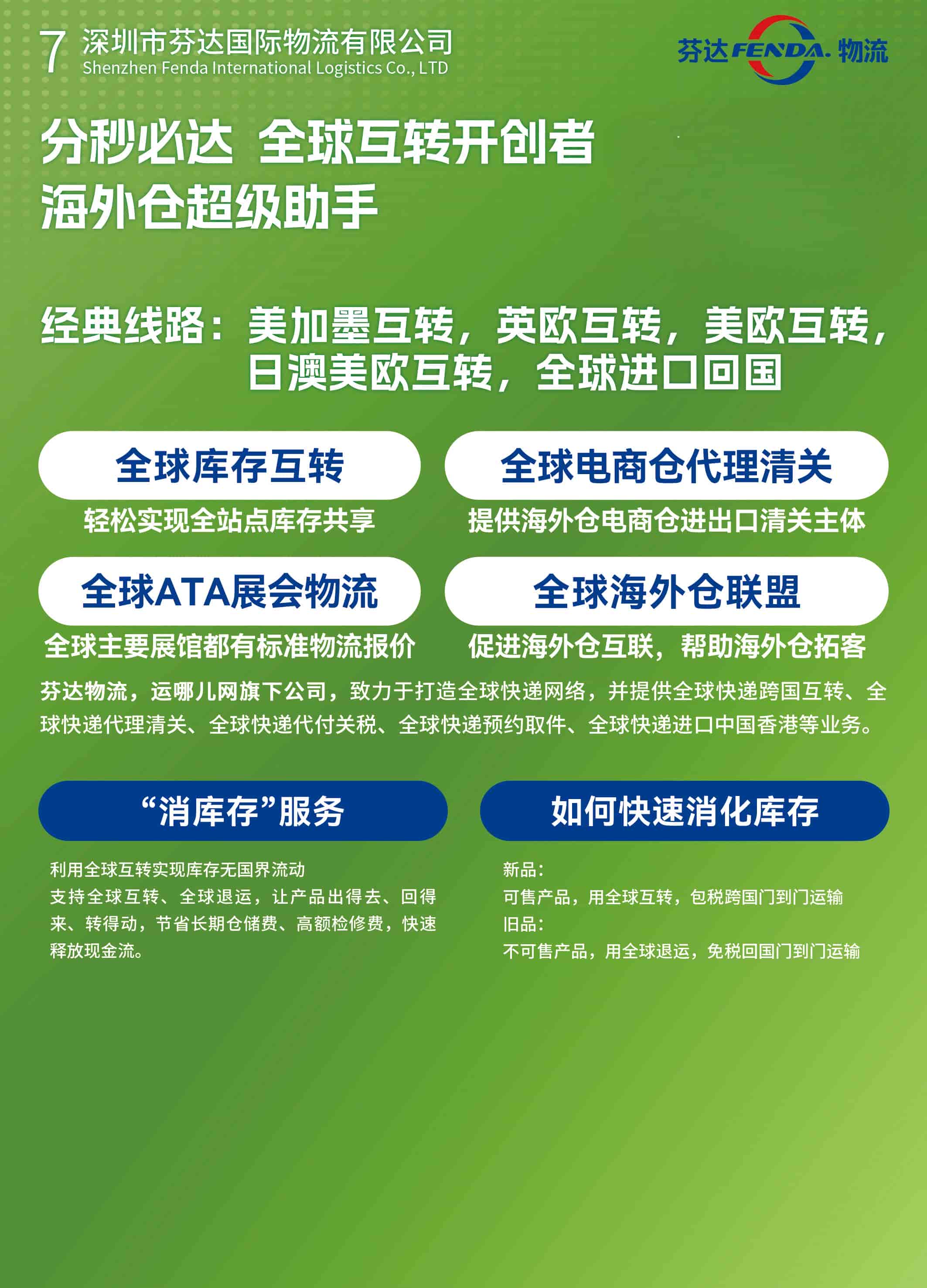 在主營(yíng)業(yè)務(wù)方面,芬達(dá)物流通過四大核心板塊發(fā)力。全球庫(kù)存互轉(zhuǎn)服務(wù)以美加墨、英歐等經(jīng)典線路為依托,實(shí)現(xiàn)全站點(diǎn)庫(kù)存共享,提升資源調(diào)配效率;全球電商倉(cāng)代理清關(guān)業(yè)務(wù)憑借專業(yè)清關(guān)團(tuán)隊(duì),為海外倉(cāng)與電商倉(cāng)進(jìn)出口提供可靠清關(guān)主體,保障貨物順利通關(guān);全球 ATA 展會(huì)物流針對(duì)展會(huì)場(chǎng)景,在全球主要展館制定標(biāo)準(zhǔn)化報(bào)價(jià),確保參展物資運(yùn)輸無(wú)憂;全球海外倉(cāng)聯(lián)盟則搭建起資源共享平臺(tái),促進(jìn)海外倉(cāng)互聯(lián)互通,助力合作伙伴拓展客戶資源,推動(dòng)全球物流生態(tài)協(xié)同發(fā)展。