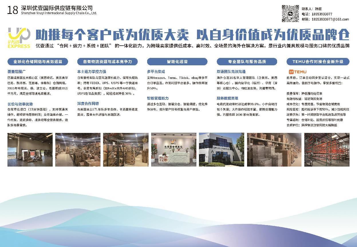 深圳優(yōu)壹國(guó)際供應(yīng)鏈有限公司是一家專(zhuān)注于跨境電商及國(guó)際品牌出海的全球供應(yīng)鏈服務(wù)企業(yè),業(yè)務(wù)涵蓋一件代發(fā)、退貨換標(biāo)、中轉(zhuǎn)、倉(cāng)儲(chǔ)、提貨拆柜與末端派送等一站式綜合服務(wù)。公司已完成覆蓋全美五大核心區(qū)域(美西奇諾、美東賣(mài)爾巴尼、新澤西、芝加哥、休斯頓)的倉(cāng)儲(chǔ)布局,實(shí)現(xiàn)全美高效協(xié)同。同時(shí),公司正積極拓展歐洲市場(chǎng),將于2025年中上線(xiàn)英國(guó)、德國(guó)、波蘭海外倉(cāng)服務(wù),打造覆蓋歐美、輻射全球的國(guó)際供應(yīng)鏈體系,為企業(yè)出海提供堅(jiān)實(shí)的物流與倉(cāng)儲(chǔ)保障。