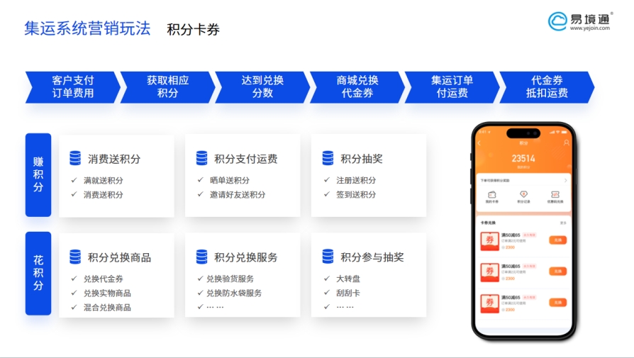 易境通集運系統(tǒng)推出的積分卡券功能,完美地將積分營銷與會員管理結合在一起,提供了多種積分使用場景,助力企業(yè)實現(xiàn)高效營銷。