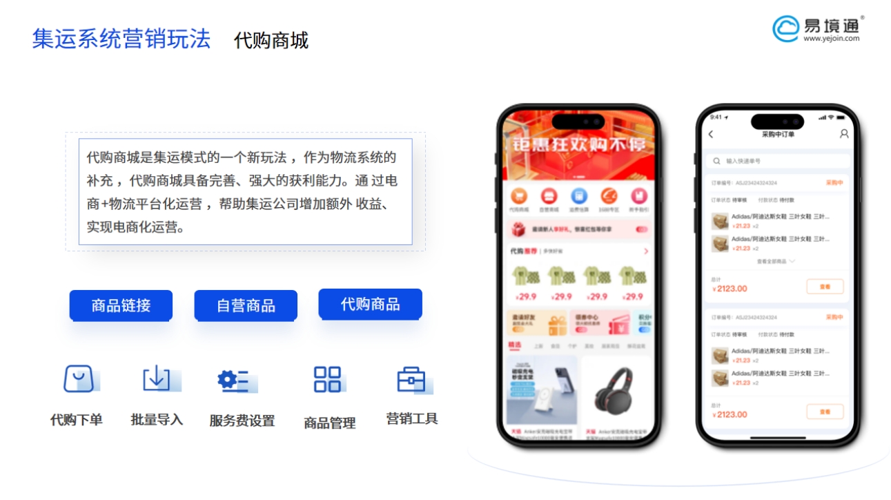 易境通代購商城系統(tǒng)易境通代購商城系統(tǒng)將集運和代購兩個業(yè)務需求無縫結合,為消費者提供一站式的物流服務,使得海外消費者能夠便捷地購買到心儀的中國商品。
